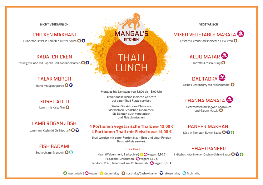 In unserer Speisekarte finden Sie neben traditionellen indischen Gerichten mit Lamm und Huhn auch viele Angebote für Vegetarierer und Veganer.